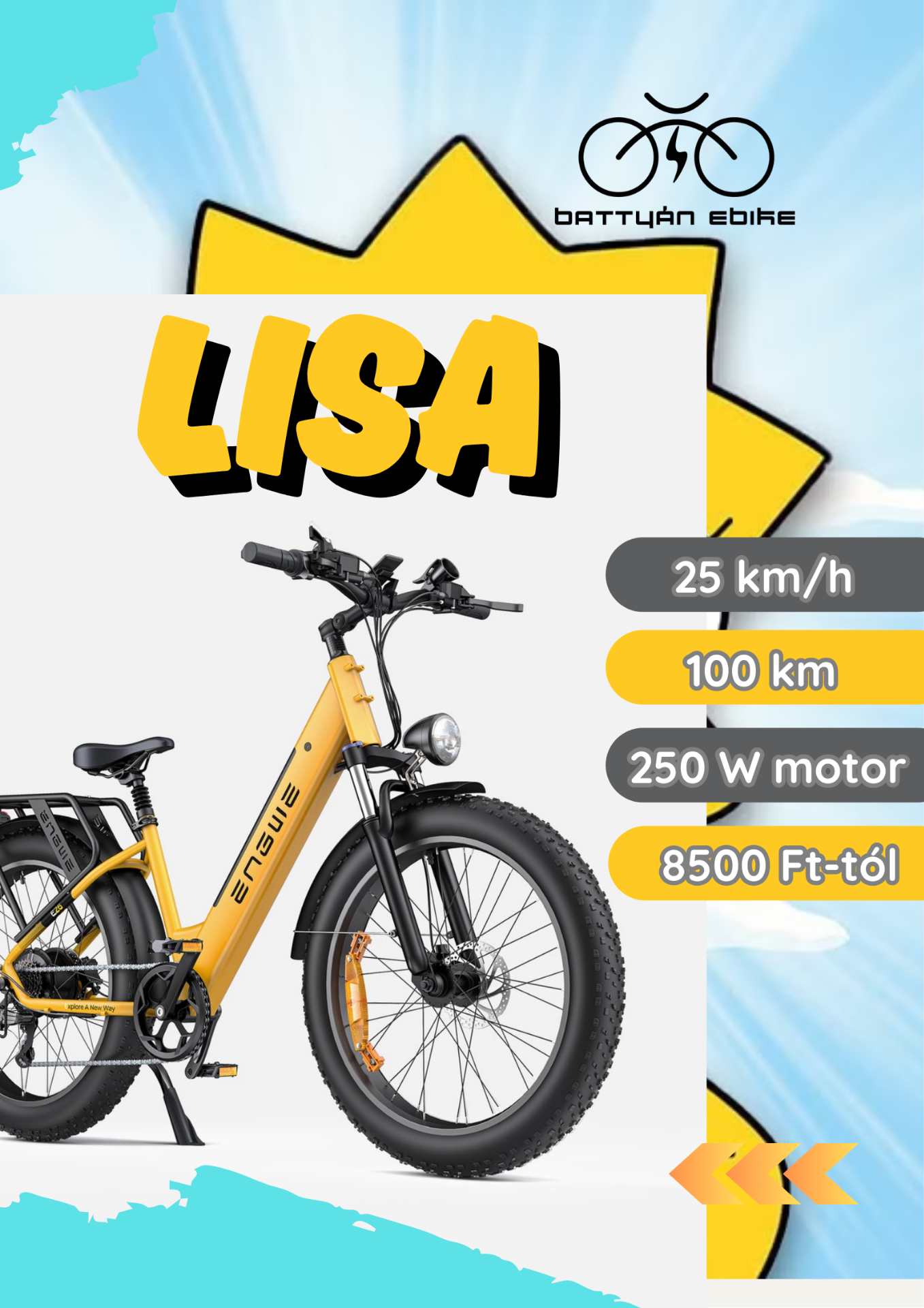 Okos, vagány, elhivatott, és feltűnően sárga színével igazi lázadó, akár Lisa Simpson. Ha Te sem ismered a lehetetlent és imádod a feltűnést, akkor ezt a kerékpárunkat vidd el a kalandodra!. Mindegy milyen terepre tévedsz, állja a sarat. Hatalmas kerekei, és 25km/h maximum sebessége minden elképzelést felülmúl. Pedálszenzorossága egy kis hozzászokást igényel, de aztán legjobb bajtársaddá válik. Alacsony átlépésű, ülésmagassága és kormánya is állítható. 160 cm magasságtól ajánlott. Teljes felszereltséggel bérelhető.